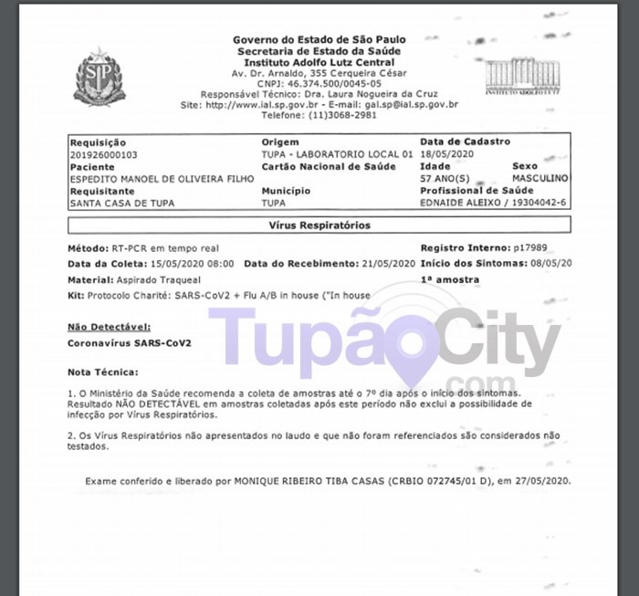 O jornalista e colunista de Tupã, Ditto Oliveira, testou negativo para o coronavírus, conforme o exame enviado ao TupãCity por familiares nesta quarta-feira (27).