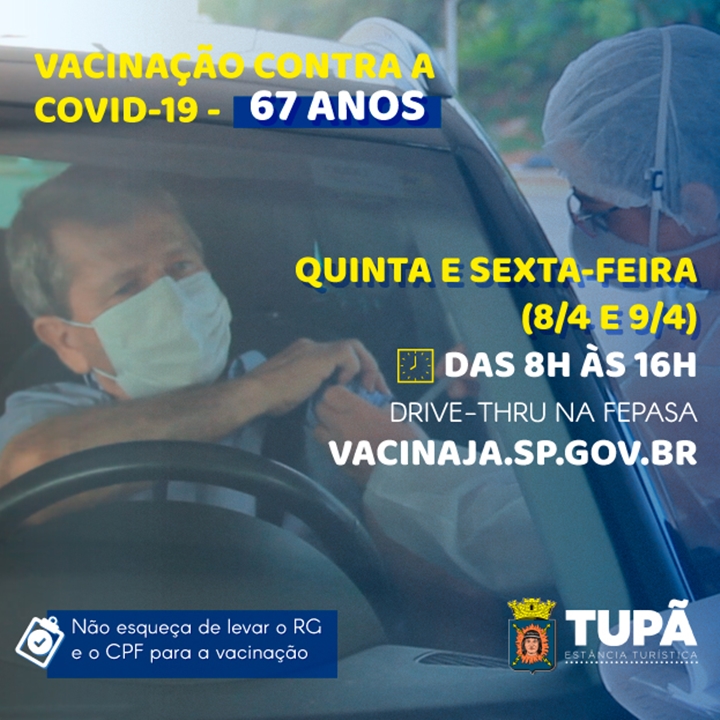 A Prefeitura de Tupã, por meio da Secretaria Municipal da Saúde, definiu a programação da aplicação da primeira dose contra a Covid-19 para os idosos da faixa etária de 67 anos. A vacinação acontecerá nos dias 8 e 9 de abril, das 8h às 16h, em sistema drive-thru na antiga FEPASA. A prefeitura aguardou as orientações do Plano Nacional de Imunizações, no entanto, até a noite de ontem não havia previsão de novos grupos para vacinação nesta semana. Segundo dados do sistema da Secretaria de Estado da Saúde, o município recebeu 18.198 frascos multidoses disponibilizados pelo Ministério da Saúde. Dessa forma, a imunização pode continuar conforme planejamento da Secretaria de Saúde de Tupã. De acordo com VaciVida, Tupã já aplicou um total de 14.929 doses da vacina, incluindo a primeira e segunda doses, até as 18h de terça-feira, dia 6 de abril. 11.077 receberam a primeira dose, representando 16,9% da população, sendo que do total geral, 3.852 pessoas já tomaram a segunda dose da vacina. Nesta quarta-feira (7) as equipes continuam vacinando os idosos a partir de 68 anos que faltaram no dia agendado para vacinação.