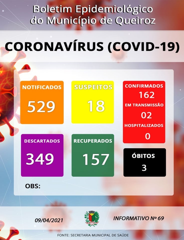 A Prefeitura de Queiroz divulgou nesta sexta-feira (9) a nova atualização do boletim covid da cidade. Segundo os dados, o município teve sete novas notificações, 18 casos suspeitos ainda aguardam resultado do exame, três casos descartados após resultado negativo para a doença. A cidade ainda conta com dois casos em período de transmissão da doença. A Prefeitura orienta que a população continue respeitando as orientações, utilizando máscara e álcool em gel. Além disso, ainda solicita que quem puder, fique em casa! Quanto menor for o fluxo de pessoas, menor o risco do vírus circular.