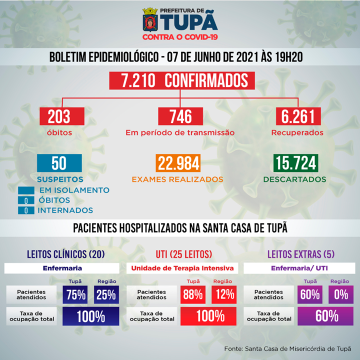A taxa de ocupação dos 25 leitos de UTI está em 100%, com 22 pacientes de Tupã (88% do total) e 3 da região (12%), sendo 2 de Bastos e 1 de Iacri. A taxa de ocupação dos 20 leitos clínicos (enfermaria) também está em 100%, com 15 pacientes de Tupã (75%) e 5 pacientes da região (25%), sendo 2 de Iacri, 1 de Bastos, 1 de Queiroz e 1 de Rinópolis. Ainda segundo os dados, dos 5 leitos extras, 3 estão ocupados (60%), todos com pacientes de Tupã.