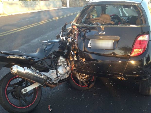 Vítima foi socorrido com traumatismo craniano. Moto bateu na traseira do carro e parte dianteira afundou .
