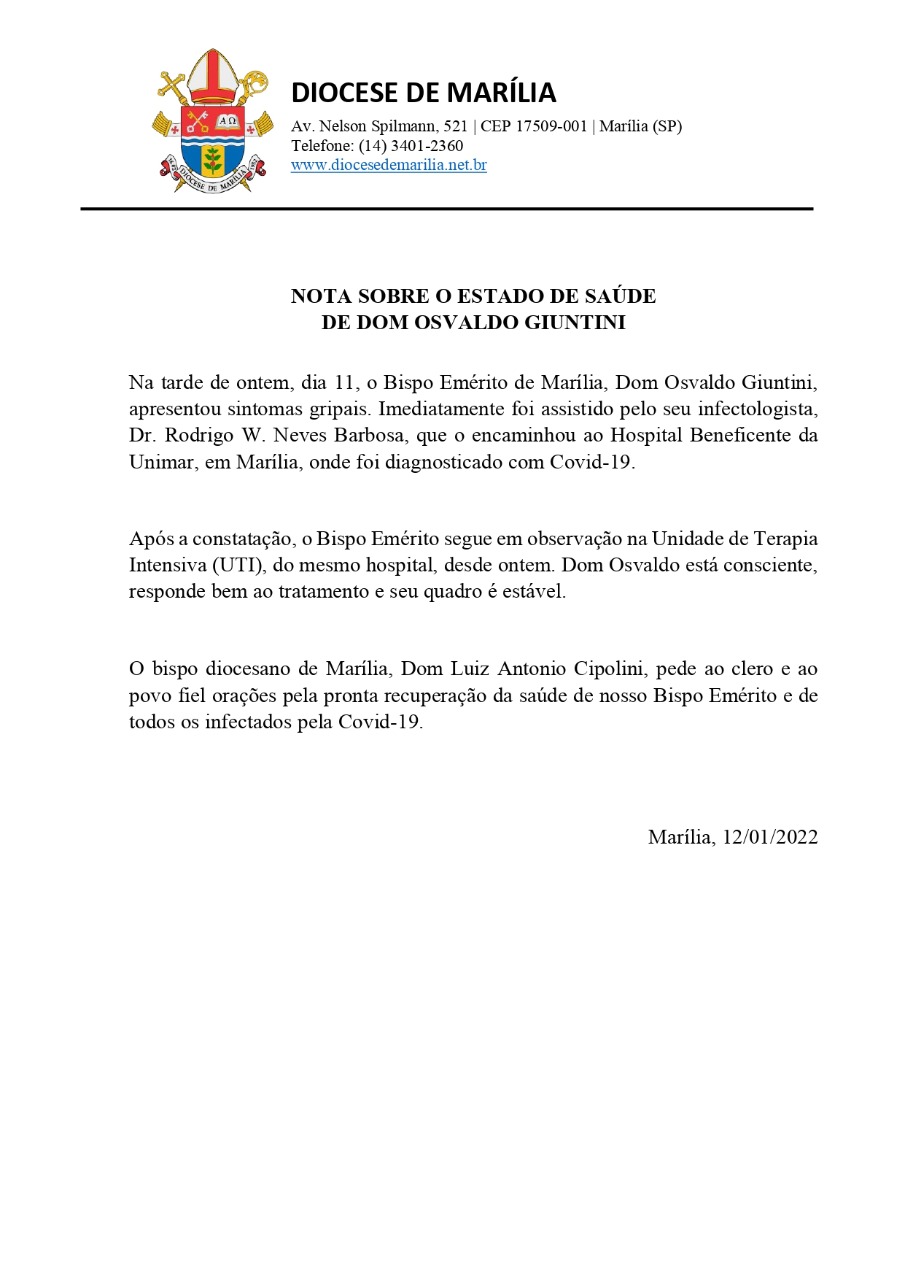 De acordo com nota da Diocese de Marília, no domingo, após melhora no quadro clínico, Dom Osvaldo presidiu a Santa Missa no leito hospitalar em ação de graças por todas as pessoas que rezaram por ele