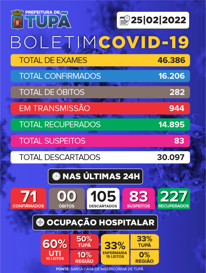 A prefeitura já realizou um total de 46.386 exames, com 30.097 resultados negativos. Já o número de casos confirmados chega a 16.206, sendo 944 ainda em período de transmissão. A cidade conta com 282 óbitos desde o início pandemia. Tupã registra ainda 83 casos suspeitos e até o momento, 14.895 pacientes já se recuperaram da doença em Tupã.
