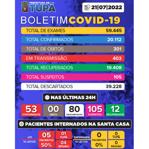 A Prefeitura divulgou os casos de coronavírus registrados nas últimas 24 horas. De acordo com o boletim epidemiológico, foram contabilizados mais 80 casos negativos e 53 novos casos positivos. Outros 105 suspeitos foram notificados e mais 12 pacientes venceram a doença e estão considerados recuperados. Até o momento foi realizado um total de 59.445 exames, com 39.228 resultados negativos. Já o número de casos confirmados chega a 20.112, sendo 403 ainda em período de transmissão. A cidade contabiliza 301 óbitos desde o início da pandemia. Tupã registra ainda 105 casos suspeitos e até o momento, 19.408 pacientes já se recuperaram da doença em Tupã. Ainda de acordo com a Santa Casa, dos 10 leitos de UTI, 5 estão ocupados por pacientes de Covid (ocupação de 50%), com 1 paciente de Tupã e 4 da região, sendo 1 morador de Parapuã, 1 de Pacaembu, 1 de Iacri e 1 de Osvaldo Cruz. Já com relação aos 10 leitos de enfermaria, todos estão desocupados, o que representa taxa de ocupação de 0%.