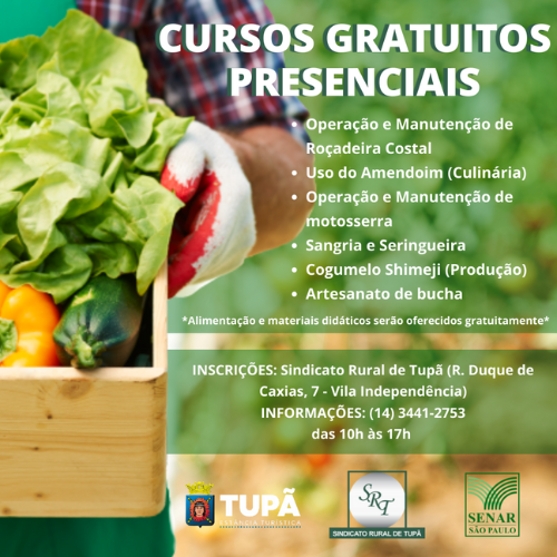 O Sindicato Rural, em parceria com o SENAR e a Prefeitura de Tupã, informa que vagas para mais 6 cursos gratuitos estão disponíveis. Os cursos já estão com datas programadas para as aulas, que deverão acontecer durante o mês de agosto e estendidas até os primeiros dias de setembro.
