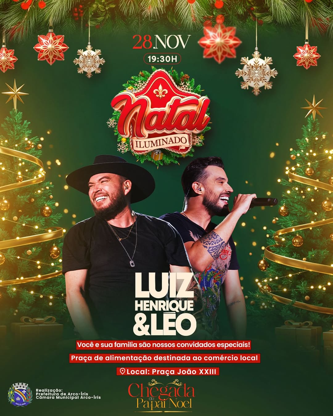O destaque da noite será a chegada do Papai Noel e o show da dupla Luiz Henrique & Léo, que promete animar o público com repertório variado.