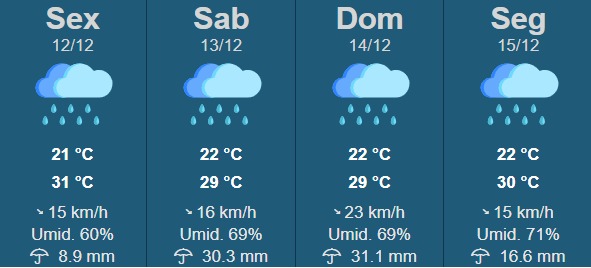 No sábado (13), o sistema de baixa pressão segue atuando, mantendo o céu entre parcialmente nublado e nublado, com períodos de chuva e trovoadas isoladas. As temperaturas apresentam leve declínio, com mínima de 22 °C e máxima de 29 °C.