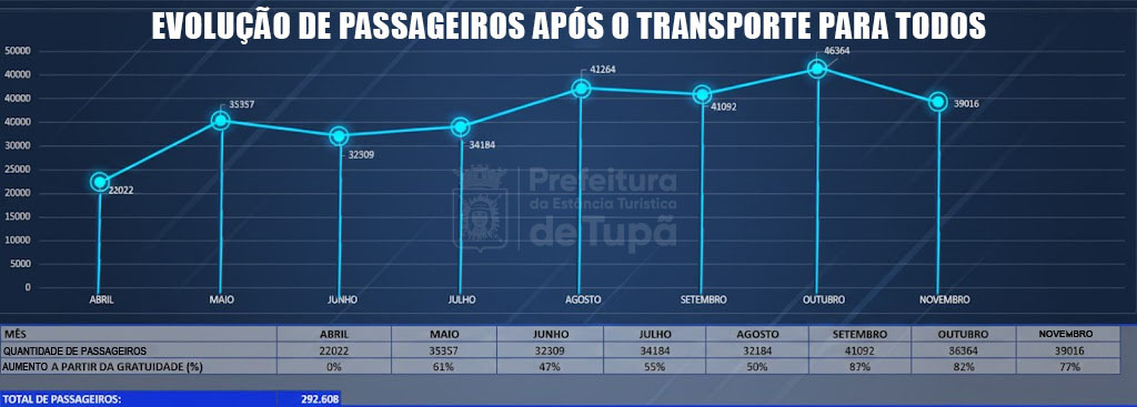 O programa Transporte para Todos, que oferece transporte público gratuito em Tupã, já contabilizou 292.608 passageiros entre os dias 1º de maio e 30 de novembro deste ano. Os dados foram divulgados pela Subsecretaria de Trânsito e apontam crescimento no uso do ônibus circular como principal meio de deslocamento diário no município.