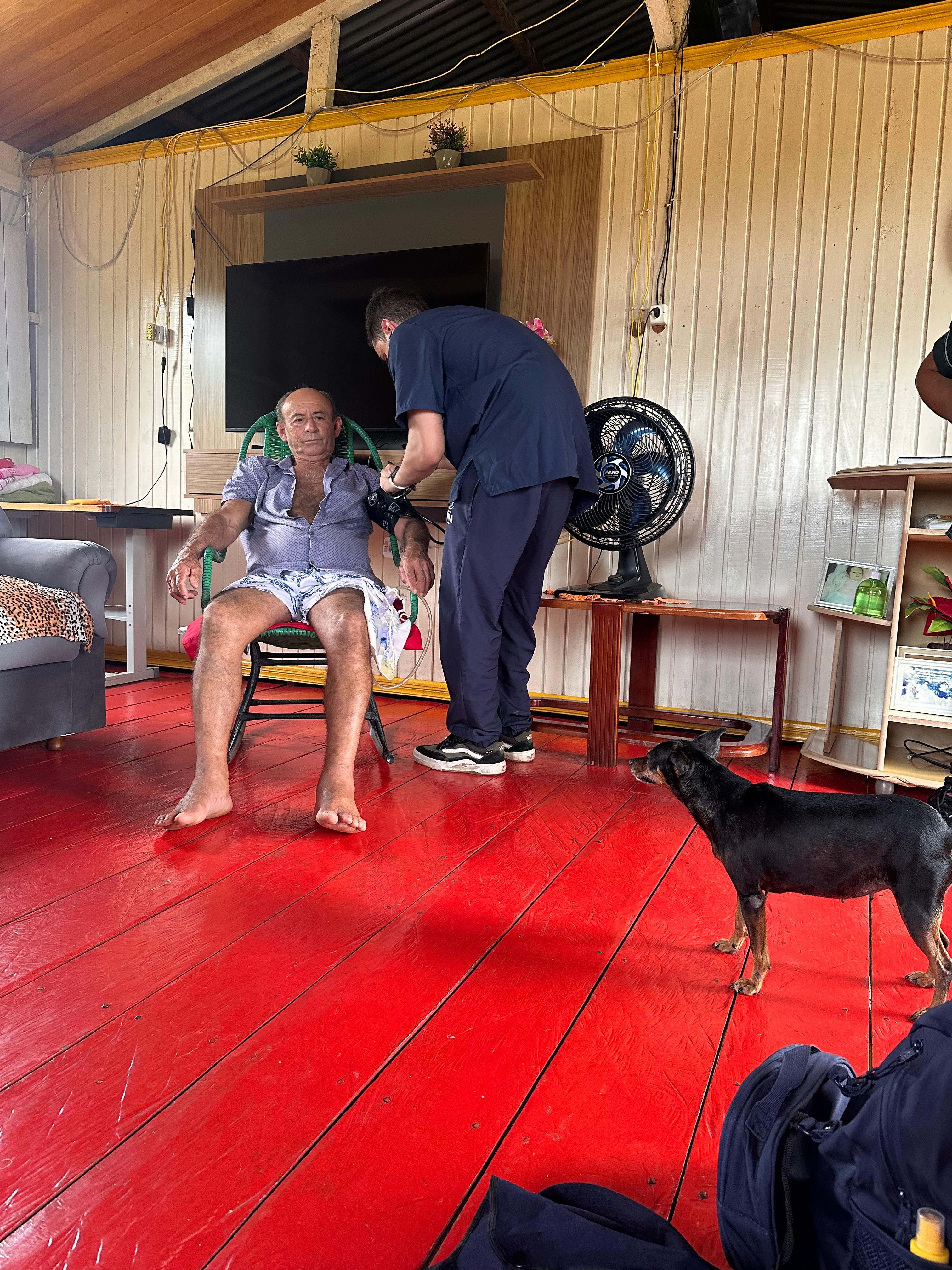 Gabriel participou das visitas domiciliares logo no início da missão. “A gente passa o dia inteiro no rio, literalmente cortando o Solimões, parando nas casas flutuantes para fazer atendimento. Tem casa no meio da floresta, em lugares que, para nós, parecem o nada”, afirma.