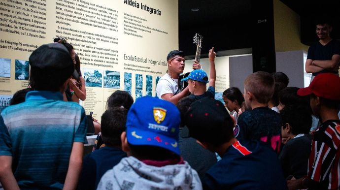Confira o processo vivo que conduz à revitalização da exposição de longa duração do Museu — uma trajetória marcada pelo cuidado, diálogo e respeito. Os visitantes acompanham os registros dos encontros entre a equipe do Museu e as comunidades indígenas Kaingang e Krenak da Terra Indígena Vanuíre; Terena e Kaingang da Terra Indígena Icatu; e Guarani Nhandewa, Terena e Kaingang da Terra Indígena Araribá.