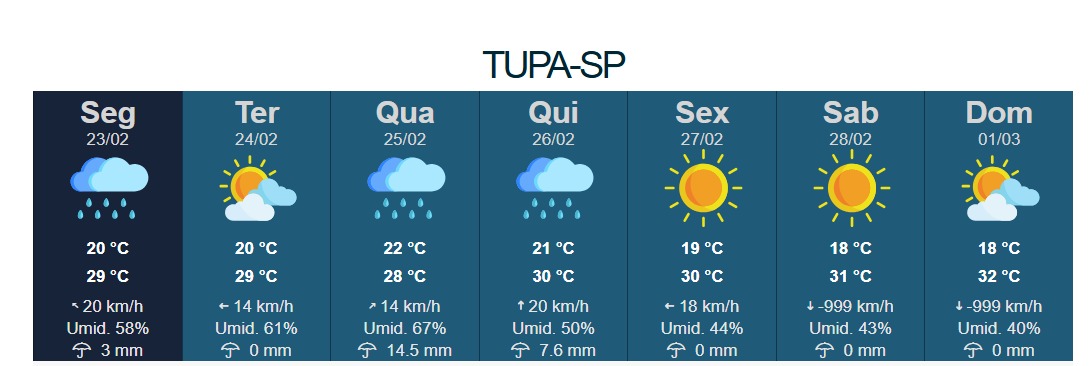 Já na quinta-feira (26/02), a chegada de uma frente fria ao litoral paulista reforça as instabilidades também no interior. Em Tupã, são esperadas novas pancadas de chuva. As temperaturas variam entre 21°C e 30°C, com previsão de até 7,6 milímetros.