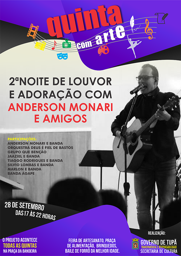 O projeto Quinta com Arte de hoje terá a 2ª noite de Louvor e Adoração e contará com um show Gospel com a participação de vários artistas e bandas Gospel de Tupã e região. O evento terá a mega apresentação de Anderson Monari e Banda, Orquestra Deus é Fiel de Bastos, Grupo Que Benção, Jaziel e Banda, Tiaggo Rodrigues e Banda, Sílvio Lombas e Banda, Marlon e Banda e Banda Ágape.