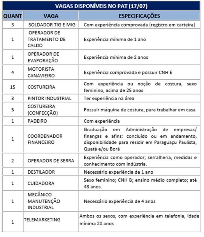 O Posto de Atendimento ao Trabalhador (PAT) de Tupã, órgão mantido por meio da Secretaria Municipal de Desenvolvimento e Comércio Exterior, oferece mais 40 oportunidades de emprego em diversos setores. Entre as vagas ofertadas para esta semana, estão: costureira (confecção), padeiro, coordenador financeiro, operador de serra, destilador, cuidadora, entre outros.