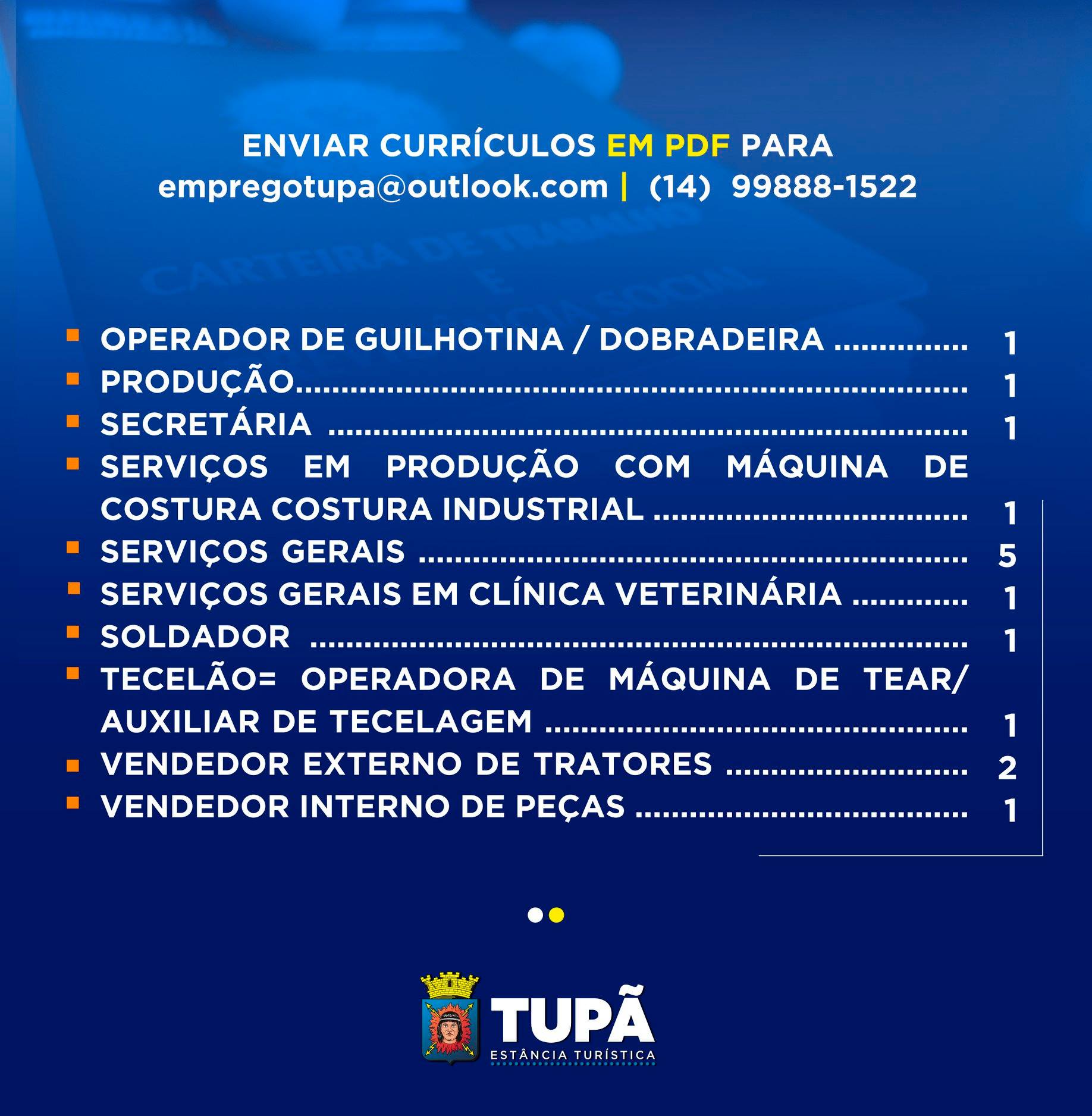 O Posto de Atendimento ao Trabalhador (PAT) tem 48 vagas de emprego abertas. Nesta segunda-feira (11), foram divulgadas oportunidades que não precisam de experiência comprovada em carteira, assim como vagas para homens e mulheres que possuam capacitação técnica nas mais variadas áreas. A chefe de setor do PAT, Marlene Stefani, reforça que os currículos devem ser enviados preferencialmente de modo virtual. Desde o início da pandemia, os candidatos têm à disposição nossos e-mail e WhatsApp. Assim, não há necessidade de deslocamento até a sede do PAT, afirmou.