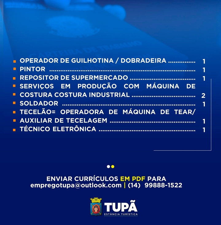 Os interessados podem enviar os currículos em PDF para o Whatsapp (14) 99888-1522 ou para o e-mail empregotupa@outlook.com.