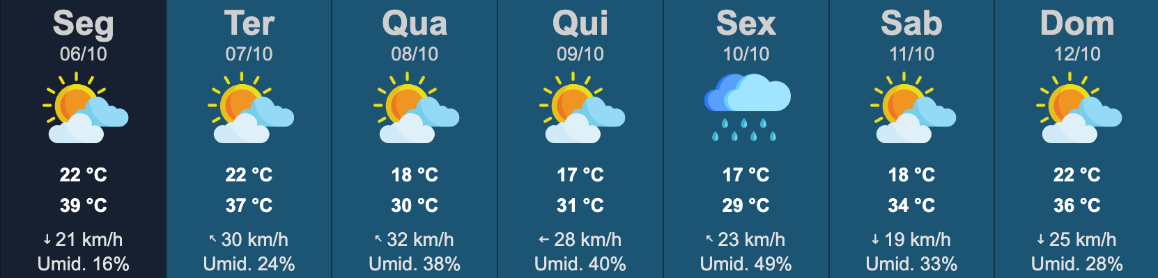 Na quinta-feira (9), o sol ainda aparece, mas há possibilidade de pancadas de chuva pela manhã e tempo mais fechado à noite. As temperaturas variam entre 17°C e 31°C. Já na sexta-feira (10), a chuva deve ganhar força, com probabilidade de temporais e mínima de 19°C.
