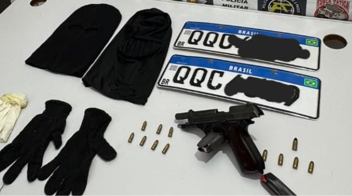 Foram apreendidos uma pistola calibre .765, sete munições calibre 32, quatro munições calibre .380, uma munição calibre 9 mm, o veículo utilizado na fuga, duas placas veiculares, duas balaclavas, um par de luvas e roupas diversas.