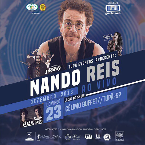 A expectativa é grande para o show do cantor Nando Reis que acontece em Tupã, no próximo dia 23 de dezembro. Ele se apresentará no Céllimo Buffet, a partir das 22h, onde cantará seus grandes sucessos. Para abrir esse grande evento, a Tupã Eventos anunciou nesta semana as atrações. A abertura será comandada pelo DJ Salim Sahao & Fuza e a Turma do Jhonny com participação da assisense Giulia Sat’ana, que foi um dos destaques do The Voice Brasil 2018. O evento também tem uma proposta social, já que 60% da renda arrecadada no estacionamento será revertida para a APAE. Os ingressos podem ser adquiridos on-line ou em pontos de venda fixos. Vale lembrar que o primeiro lote dos ingressos VIP já se esgotou. Para comprar pela internet, clique aqui e acesse o site. Já os pontos de venda fixos são: Em Tupã; Água Doce Cachaçaria, Fogos Tupã, Bella Confecções Osvaldo Cruz; Brumatti Pães Adamantina; Dona Carolina Bijuterias Lucelia: Papelaria Mundo do Papel Bastos:Água na Boca Modas Iacri: Lu Pacanaro. Rinopolis:Saygon Modas Quintana:TachinhasBeer Herculândia: Lanchonete Passa Tempo. Quatá: Droga Center. As mesas têm capacidade para até oito pessoas. Nos pontos fixos, os valores podem ser divididos em até 3x sem juros, enquanto no site o valor pode ser parcelado em até 12x. O evento é promovido pela Tupã Eventos, que está no ramo há mais de 20 anos e já foi responsável pelos shows de Paralamas do Sucesso, Fernando e Sorocaba, Roupa Nova, Zé Ramalho, Sambô, além de outros nomes de peso. O show contará com o apoio da Cachaçaria Água Doce. Cada uma das mesas também ganhará uma tábua de frios para saborear durante o evento. Nando é um dos grandes nomes da música brasileira e apresentará muitos sucessos que o público poderá curtir de perto. Em carreira solo desde 1995, ele é compositor de canções que ficaram eternizadas não apenas na sua voz, mas também de grandes artistas como Cássia Eller. Para mais informações, os telefones de contato são (18) 3324-2551 ou (14) 3441-7484.