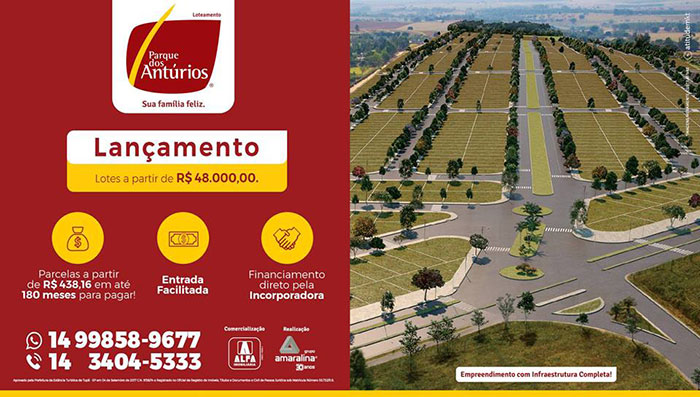 A exclusividade da venda é da Alfa Imobiliária, que atua no ramo imobiliário em Tupã há quase 25 anos com corretores experientes e capacitados. Nesta primeira fase, serão 327 lotes a partir de 200m². O lançamento acontece nos dias 29, 30 de novembro e 1 e 2 de dezembro. No próprio loteamento terá o plantão de vendas.