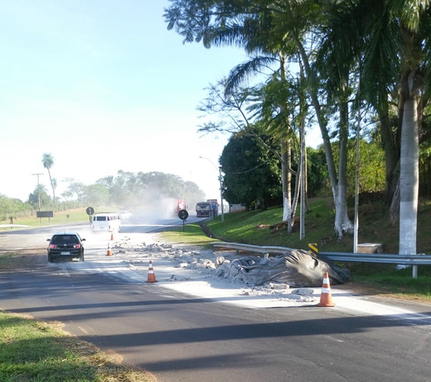 Carga de cimento se espalha na rodovia e trevo de Herculândia fica interditado